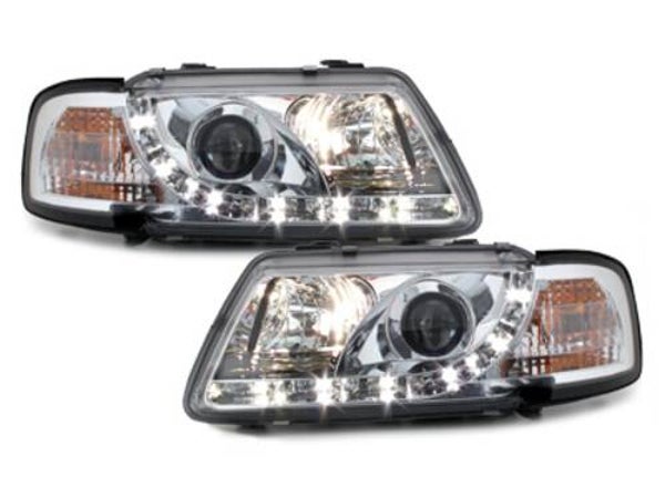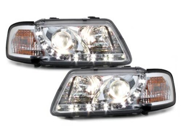 DECTANE LED DAYTIME RUNNING LIGHT OPTIC HEADLIGHTS AUDI A3 8LWith E-approval: STREET LEGAL suitable for: Audi A3 8Lyear: 09.96 - 08.00version: chrome content: 1 set includes 2 headlightscondition: new / original packagingPlug&Play: compatible to all original carriers and plug connectorserror messages excluded: all control units / resistors are included in delivery Electric highness control: prepared for electric highness controlOneblock-Design, integrated indicatorHID look lens illumination: H1 low beam, H1 high beam (included)LED stripe in daytime running light optic: approved as position lightindicator (included)