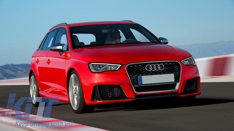 Equipped with honeycomb RS3 design central grille, side grilles, and lower bumper lip extension.