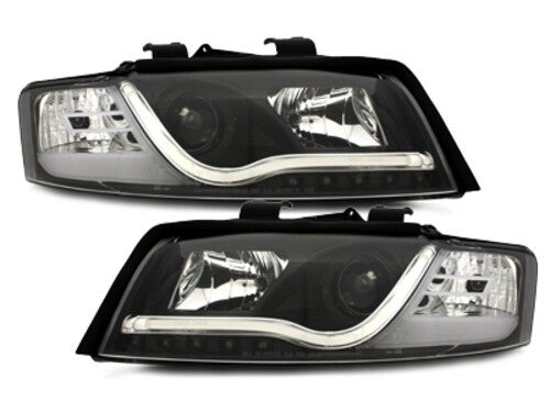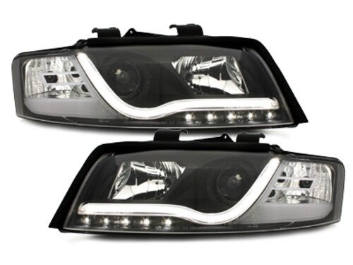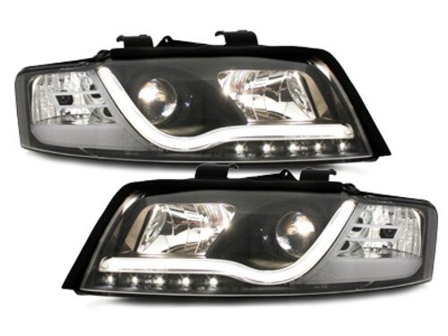 DECTANE LED DAYTIME RUNNING LIGHT HEADLIGHTS AUDI A4 8EWith E-approval: STREET LEGALR87 Mark as daytime running light  suitable for: Audi A4 8Eyear: 01 - 04version: black  WITH REAL DAYTIME RUNNING LIGHT -R87 APPROVAL  content: 1 set includes 2 headlightscondition: new / original packagingPlug&Play: compatible to all original carriers and plug connectorserror messages excluded: all control units / resistors are included in delivery Electric highness control: motor integratedOneblock-Design, integrated indicatorHID look lens illumination: H1 low beam / H1 high beam (included)LED daytime running lightposition light in light guide technologyindicator The DECTANE real daytime running light headlight stands for future developments in vehicle lighting. The headlights with the approved LED strip are equipped with real daytime running lights, which are provided with a R87 approval. So you can enjoy high quality headlights, equipped with the latest LED technology to give your vehicle a unique look, coupled with a high safety. Because of the integrated daytime running light in the headlights, they adapt perfectly to the weather conditions on the street. Also, the headlights are o.e. conform, e-approved and the installation is straightforward because of the original connectors (plug-and-play).