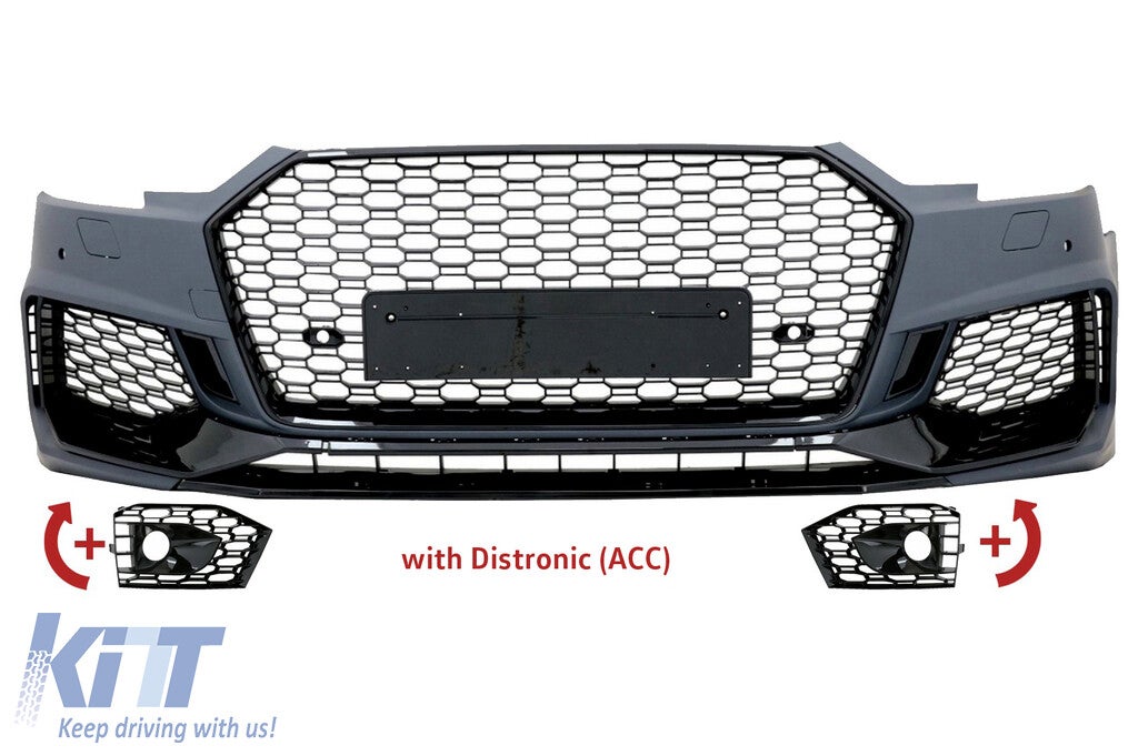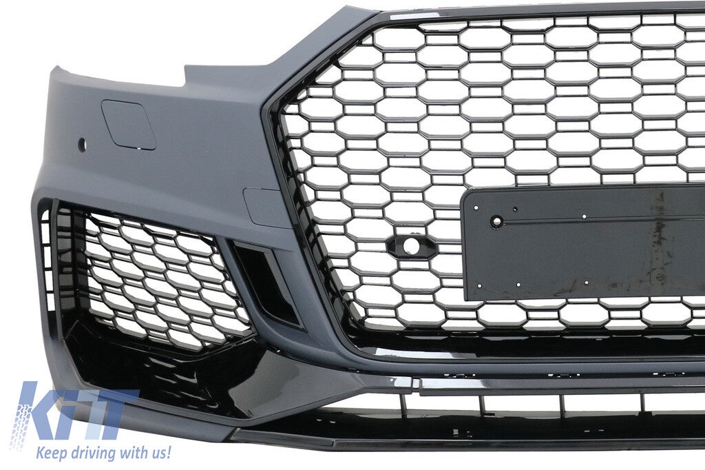 Equipped with honeycomb RS4 design central grille, side grilles, and lower bumper extension.