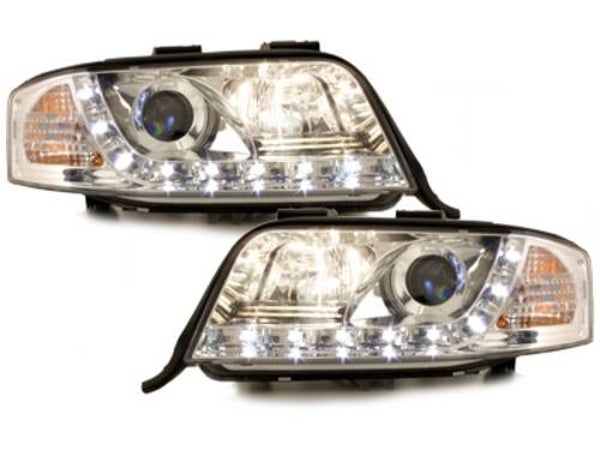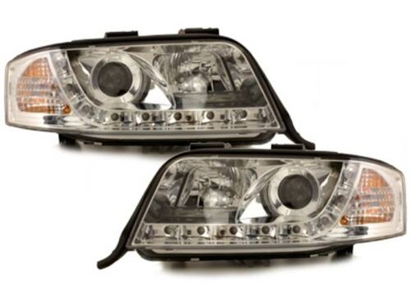 DECTANE LED DAYTIME RUNNING LIGHT OPTIC HEADLIGHTS AUDI A6 4BWith E-approval: STREET LEGAL suitable for: Audi A6 4Byear: 97 - 01version: chrome content: 1 set includes 2 headlightscondition: new / original packagingPlug&Play: compatible to all original carriers and plug connectorserror messages excluded: all control units / resistors are included in delivery Electric highness control: prepared for adjustment motor Oneblock-Design, integrated indicatorHID look lens illumination: H1 low beam, H1 high beam (included)LED-Position light in daytime running light optic: approved as position lightindicator (included)