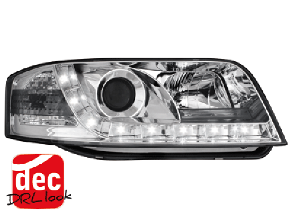DECTANE LED DAYTIME RUNNING LIGHT OPTIC HEADLIGHTS AUDI A6 4B FACELIFTWith E-approval: STREET LEGAL  suitable for: Audi A6 4B Faceliftyear: 01 - 04version: chrome  content: 1 set includes 2 headlightscondition: new / original packagingPlug&Play: compatible to all original carriers and plug connectorserror messages excluded: all control units / resistors are included in delivery Electric highness control: prepared for adjustment motor Oneblock-Design, integrated indicatorHID look lens illumination: H1 low beam, H1 high beam (included)LED position light in daytime running light optic: approved as position lightindicator (included) Â