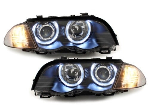 DECTANE HEADLIGHTS BMW E46 LIMOUSINE/TOURINGWith E-approval: STREET LEGAL  suitable for: BMW E46 Limousine / Touringyear: 98 - 01version: black  content: 1 set includes 2 headlightscondition: new / original packagingPlug&Play: compatible to all original carriers and plug connectorserror messages excluded: all control units / resistors are included in delivery prepared for electric highness control (Motor integrated)HID look lens illumination: H1 high beam, H1 low beam (included)2 LED halo rimsIndicator extra (included in delivery) Â